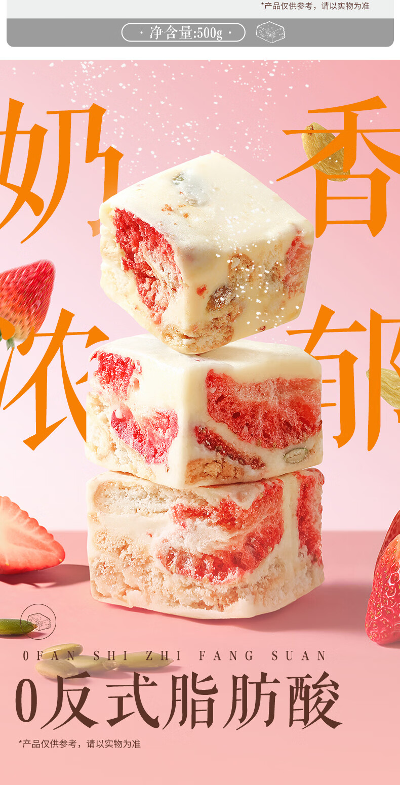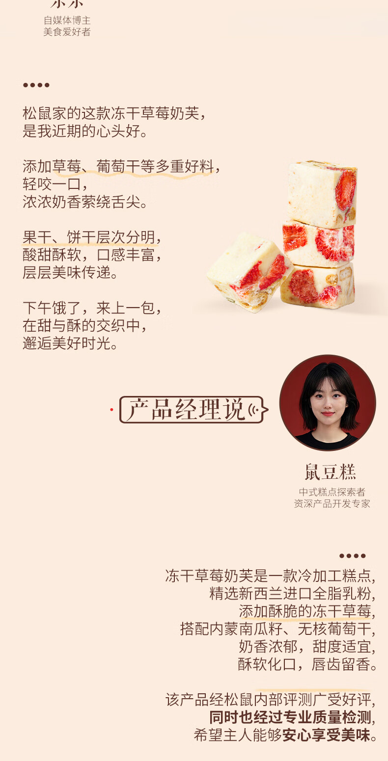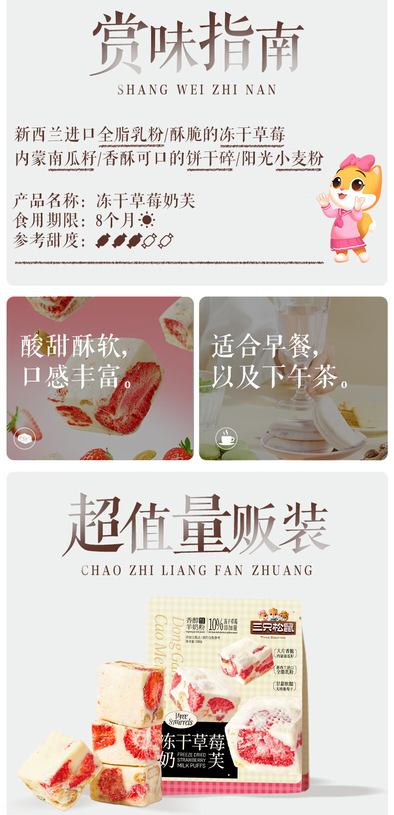 商品名称:三只松鼠冻干草莓羊奶奶芙500g 雪花酥手工拉丝饼干糕点牛轧糖网红零食