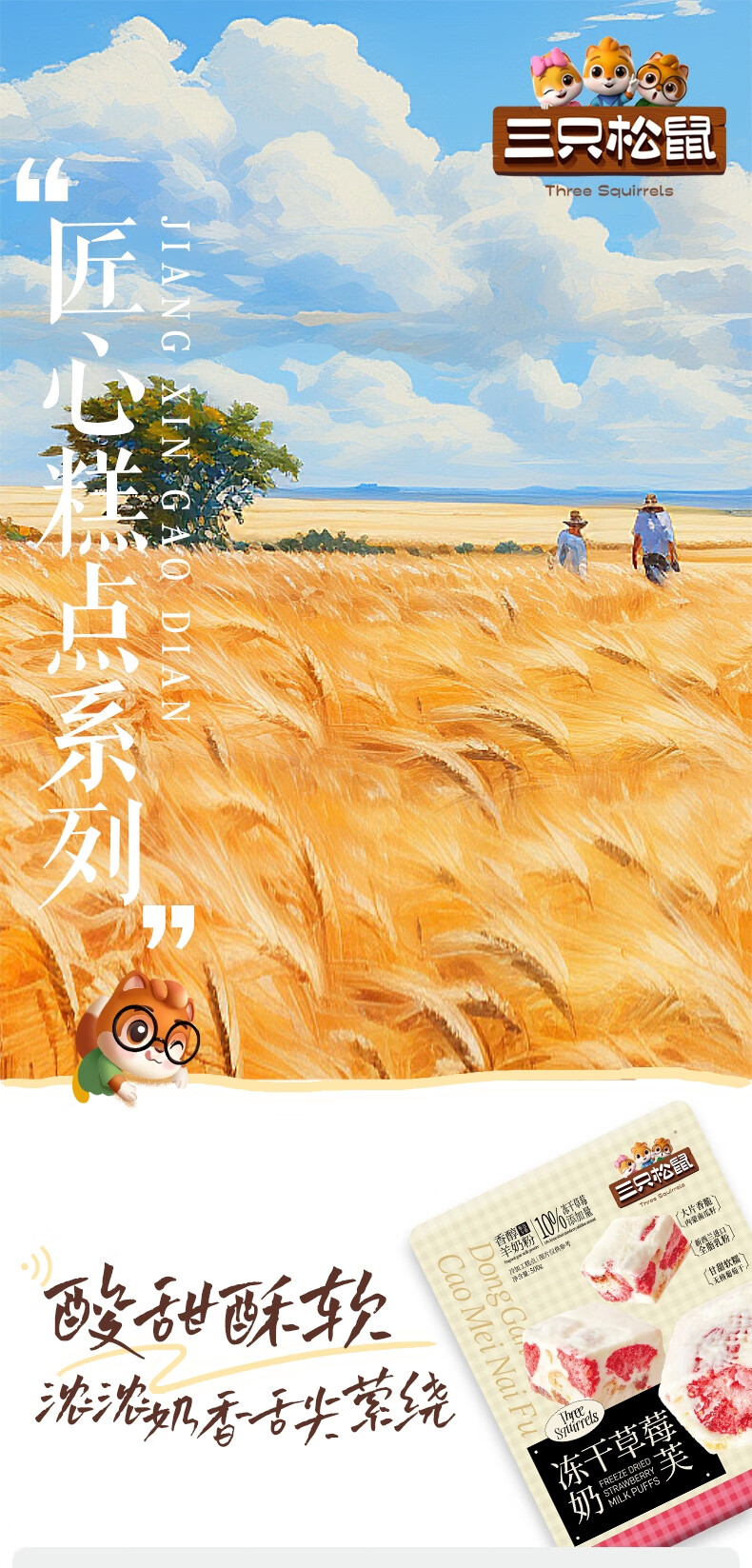 自营三只松鼠冻干草莓羊奶奶芙500g 雪花酥手工拉丝饼干糕点牛轧糖网红零食