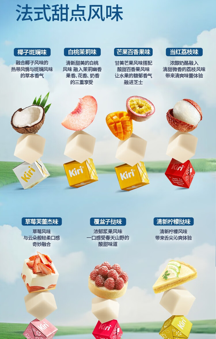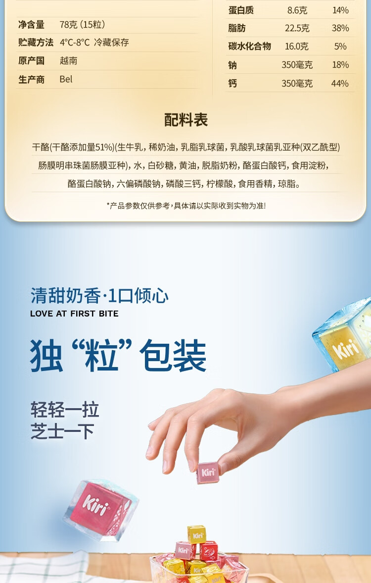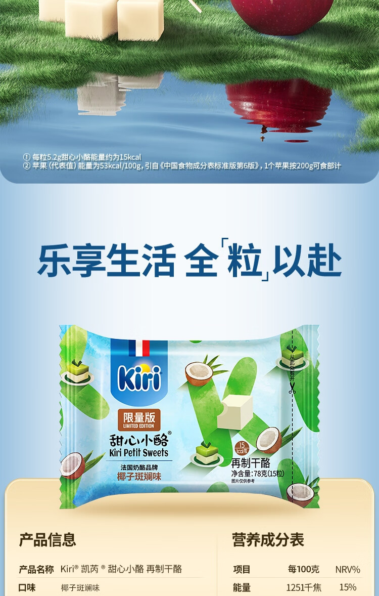 商品名称:KIRI进口甜心小酪椰子斑斓口味78g/15粒再制零食高钙奶酪【花少同款】