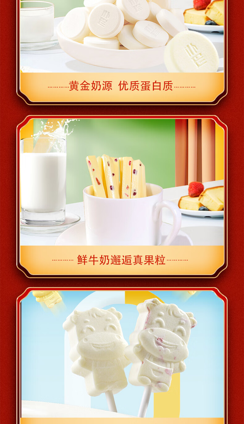 • 包装清单:128g益生元奶贝+128g牛初乳奶贝+120g益生元奶条+120g蓝莓果粒奶条+108g原味奶酥+108g奶酥酸奶味+96g棒棒奶贝含牛初乳味+52g原味奶棒+52g多维奶棒+52g高钙牛奶软条原味+52g高钙蔓越莓奶条