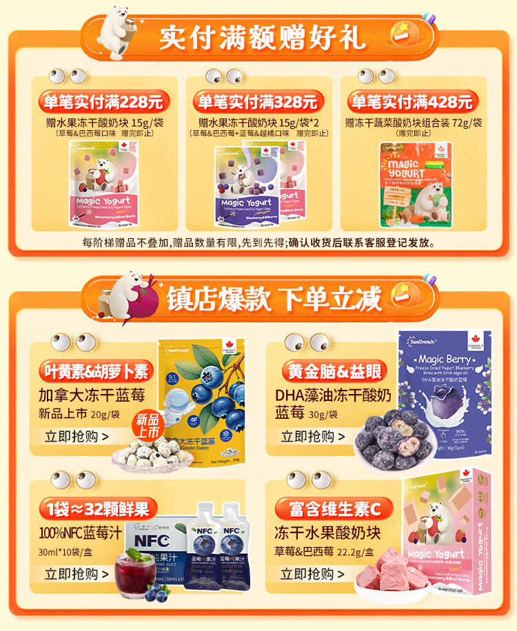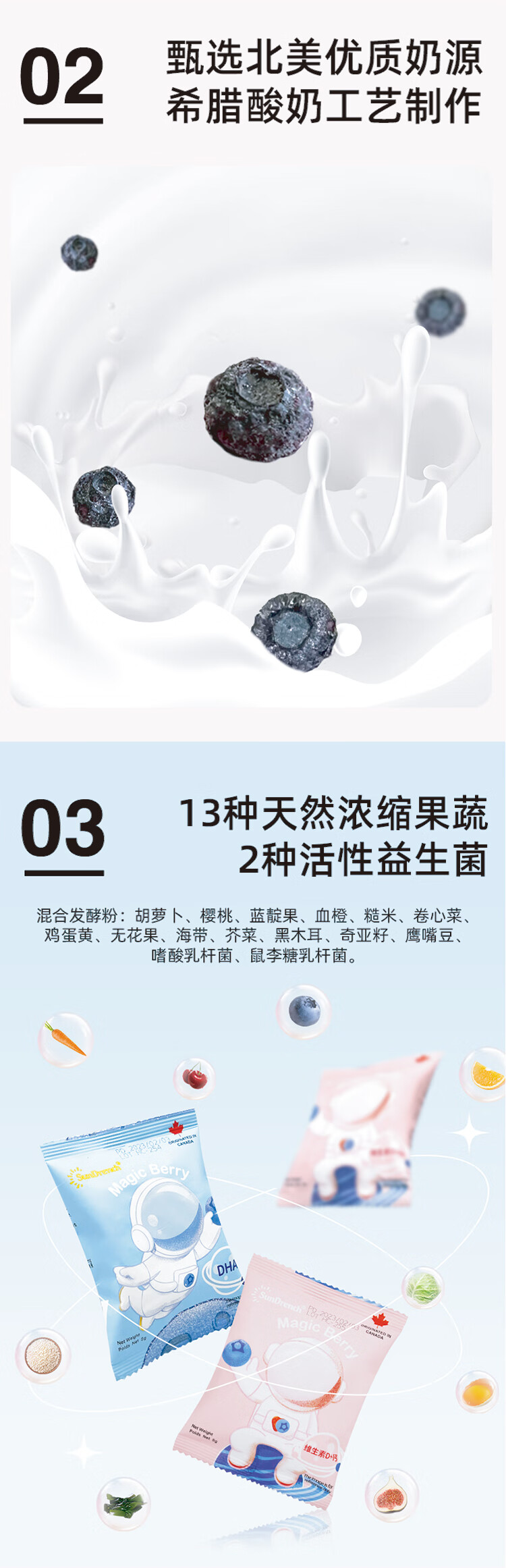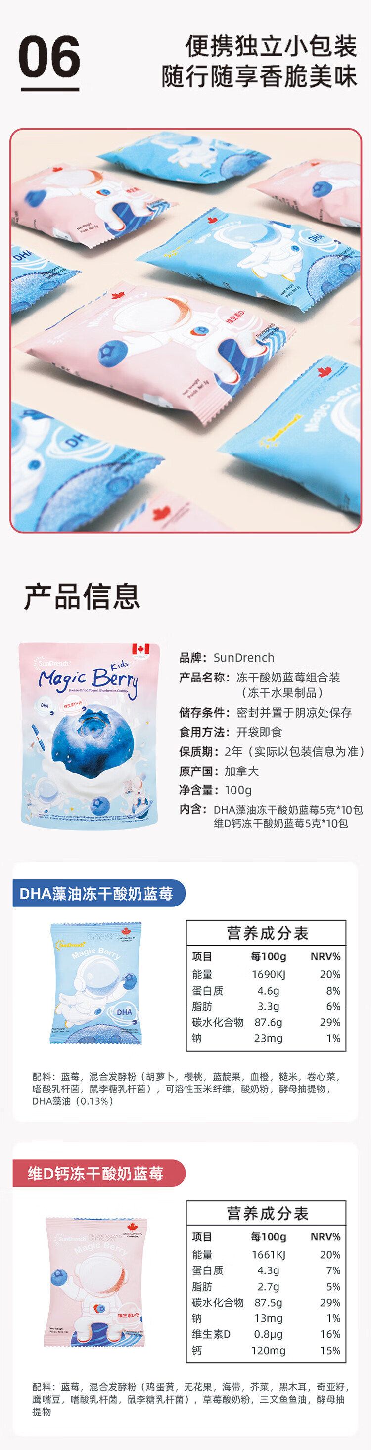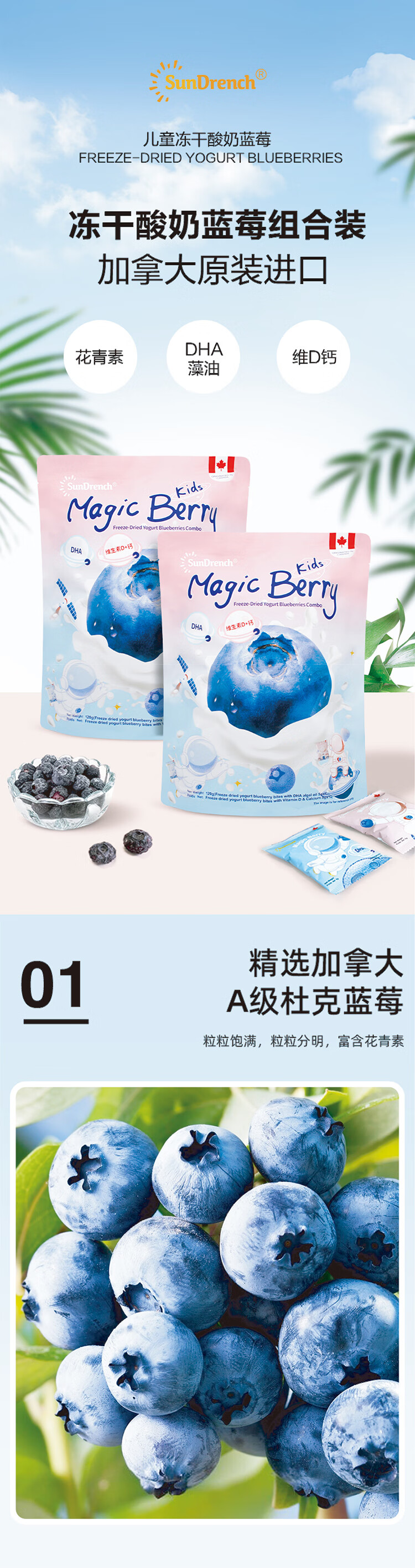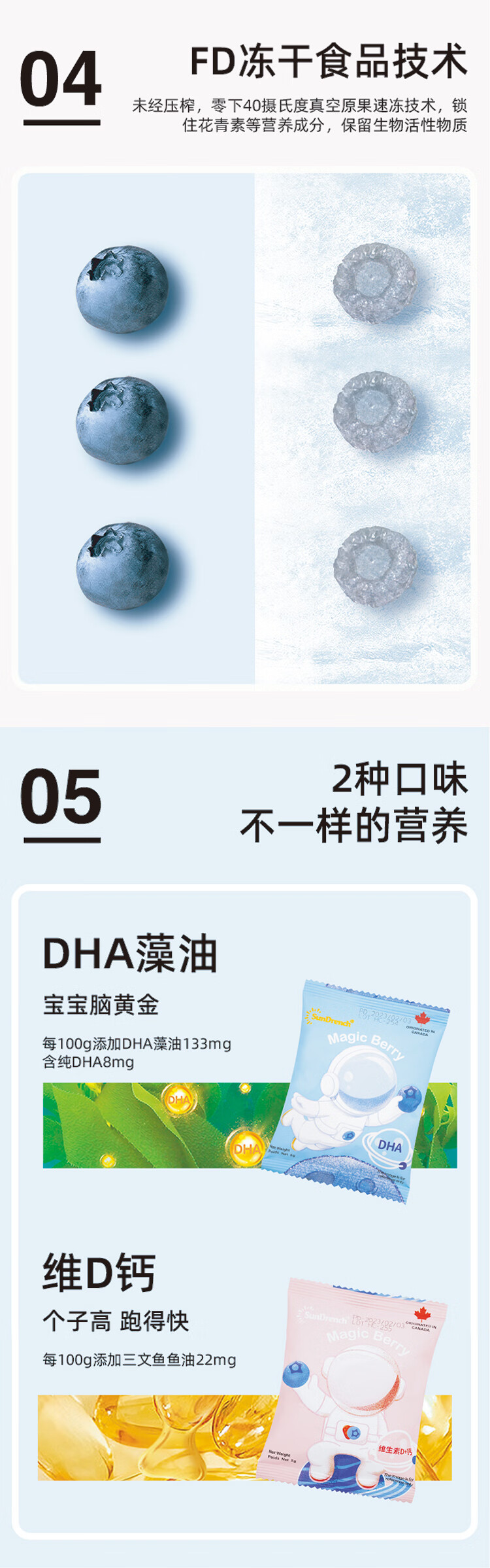 • 包装清单:SunDrench上哆力 冻干酸奶蓝莓宝宝零食维D钙&DHA藻油进口无添加组合装100g/袋(5g*20)