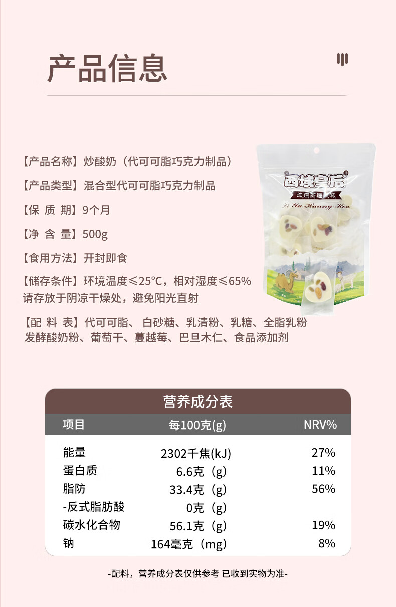 商品名称:西域皇后新疆特产坚果炒酸奶500g巴旦木奶酪疙瘩片皮子巧克力果干零食