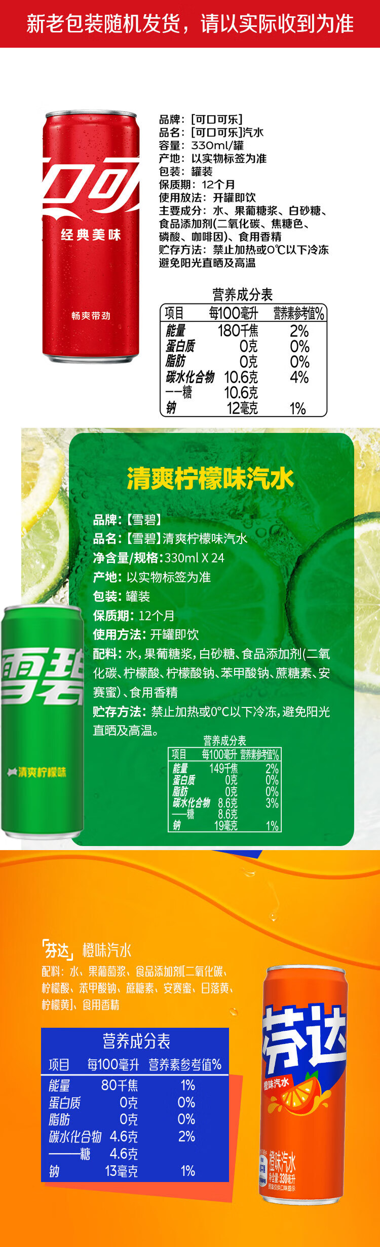 商品名称:可口可乐(Coca-Cola)可乐*12+雪碧*8+芬达*4 有糖汽水 碳酸饮料 330ml*24罐