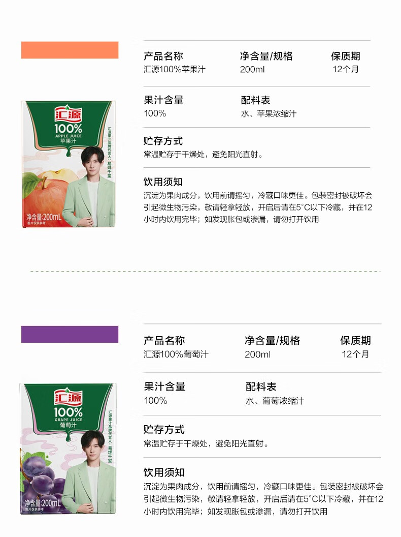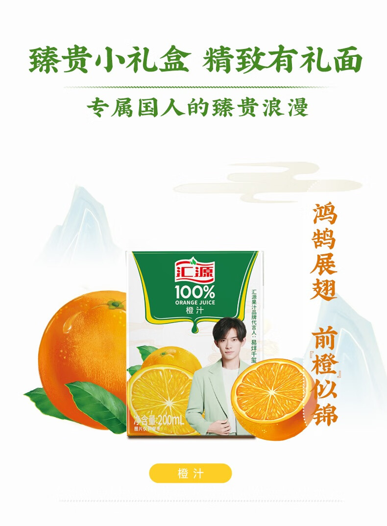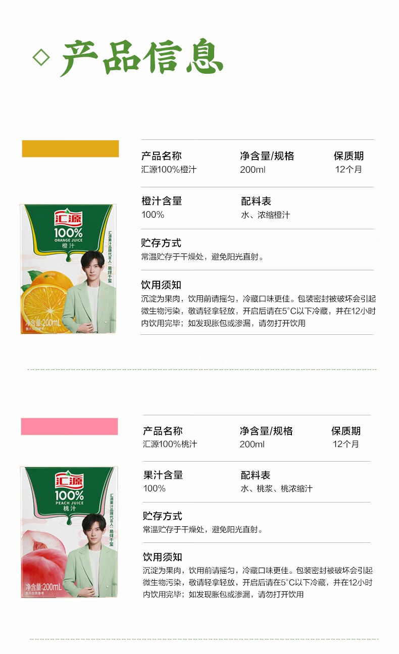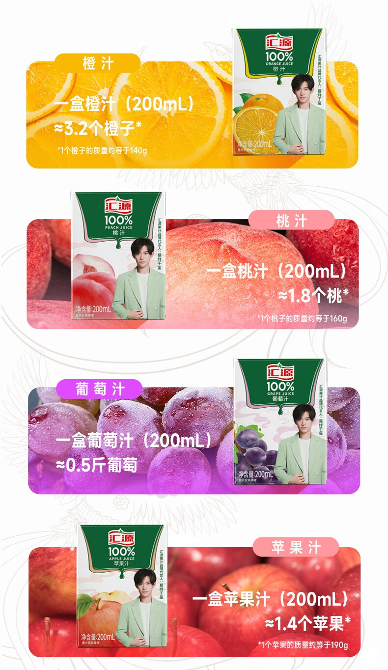 商品名称:汇源果汁汇源100%橙汁桃汁苹果汁葡萄汁0无添加纯果汁饮料浓缩果蔬汁 混合口味125ml*15盒【礼盒装】