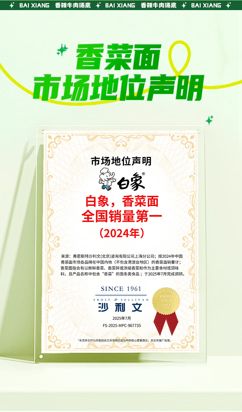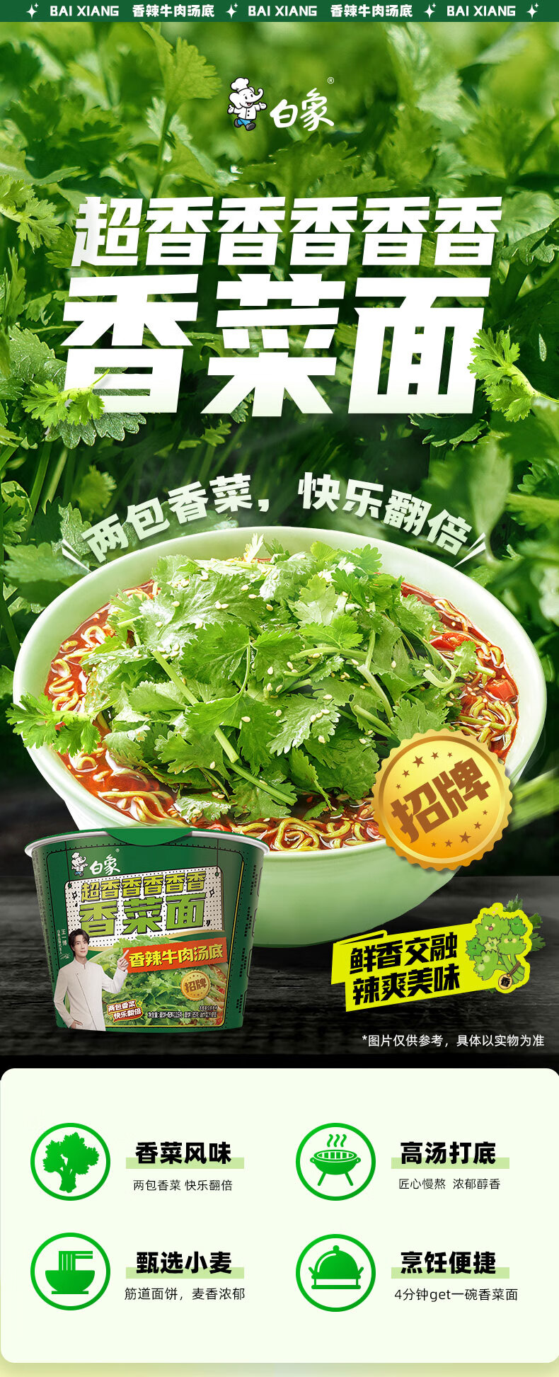 • 包装清单:白象 方便面 香菜面12桶超香香香菜面泡面整箱装桶面