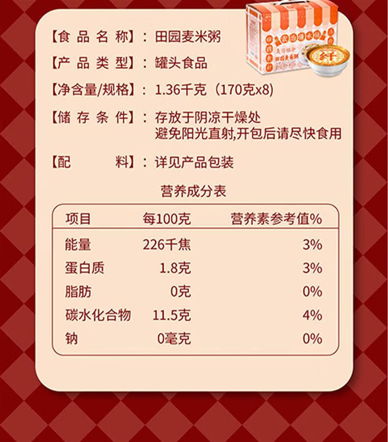 商品名称:陈皮红豆沙芝麻糊即食碗装早餐零食甜点代餐方便速食粥170g 礼盒装田园麦米粥170g*8碗