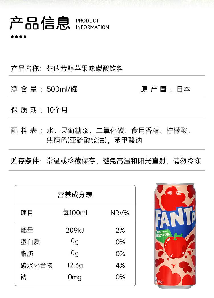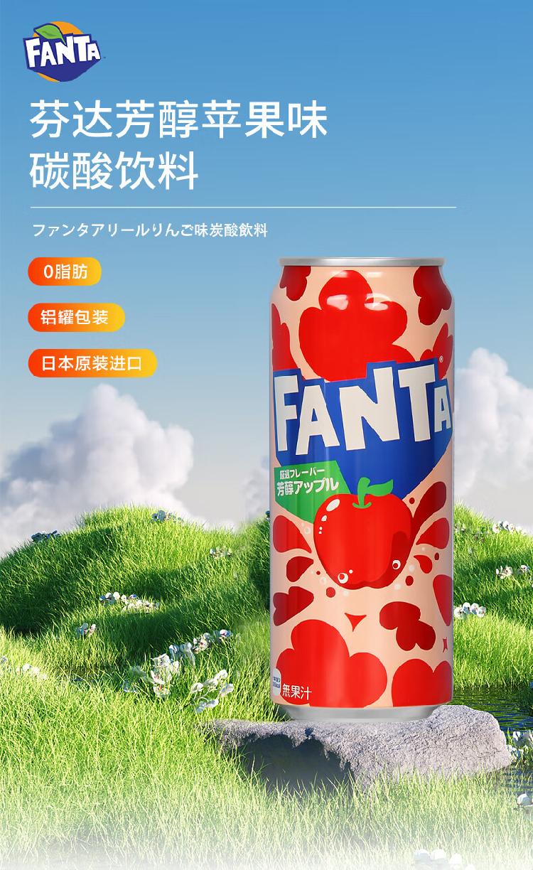 商品名称:可口可乐芬达(Fanta) 芳醇苹果味碳酸饮料日本进口500ml*24瓶原箱北海道